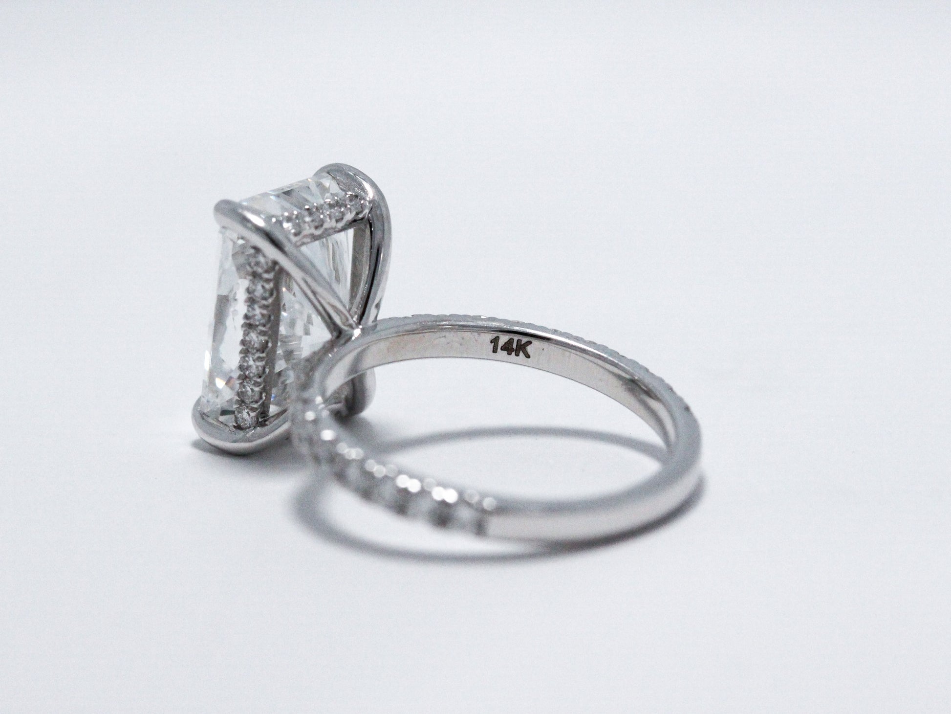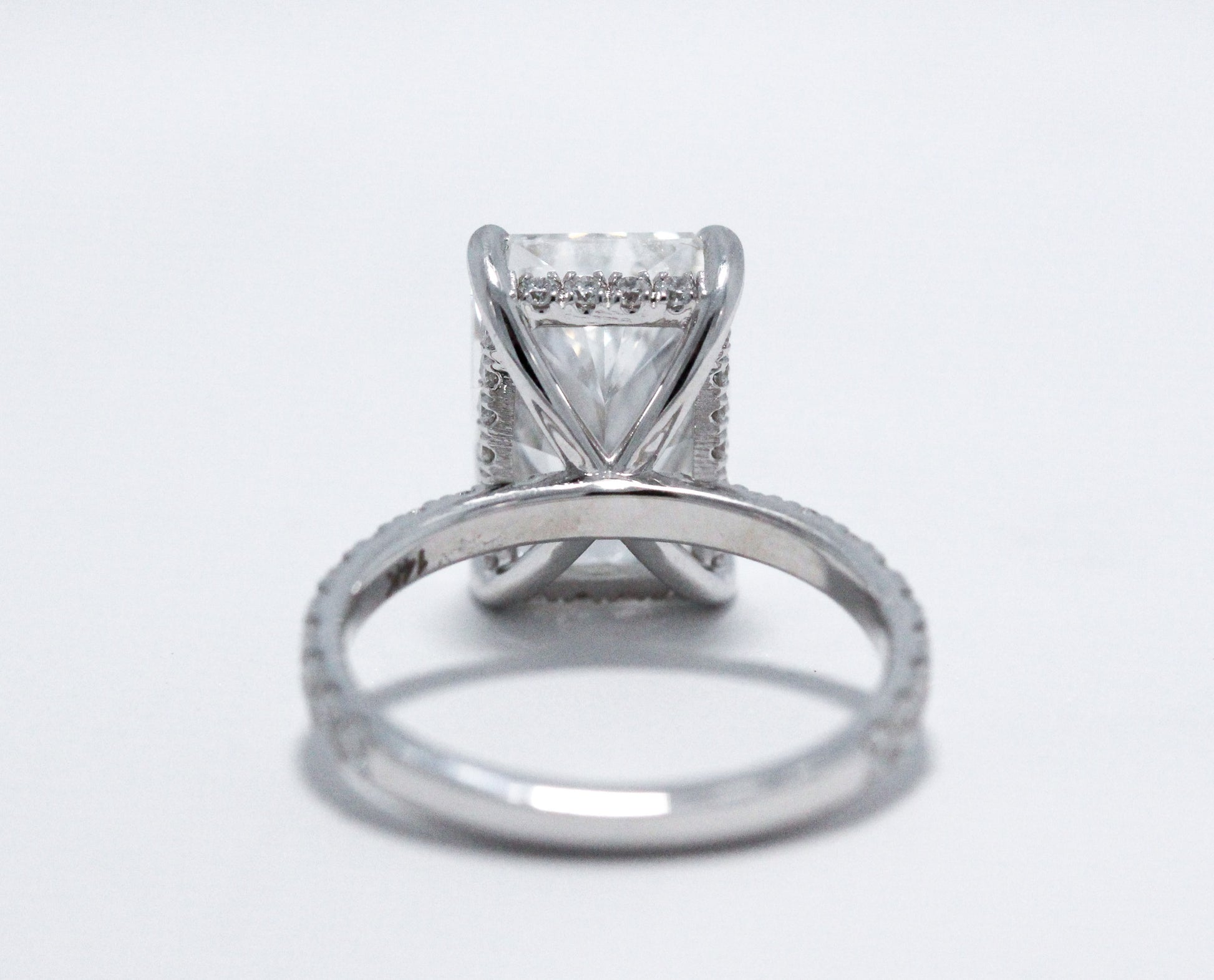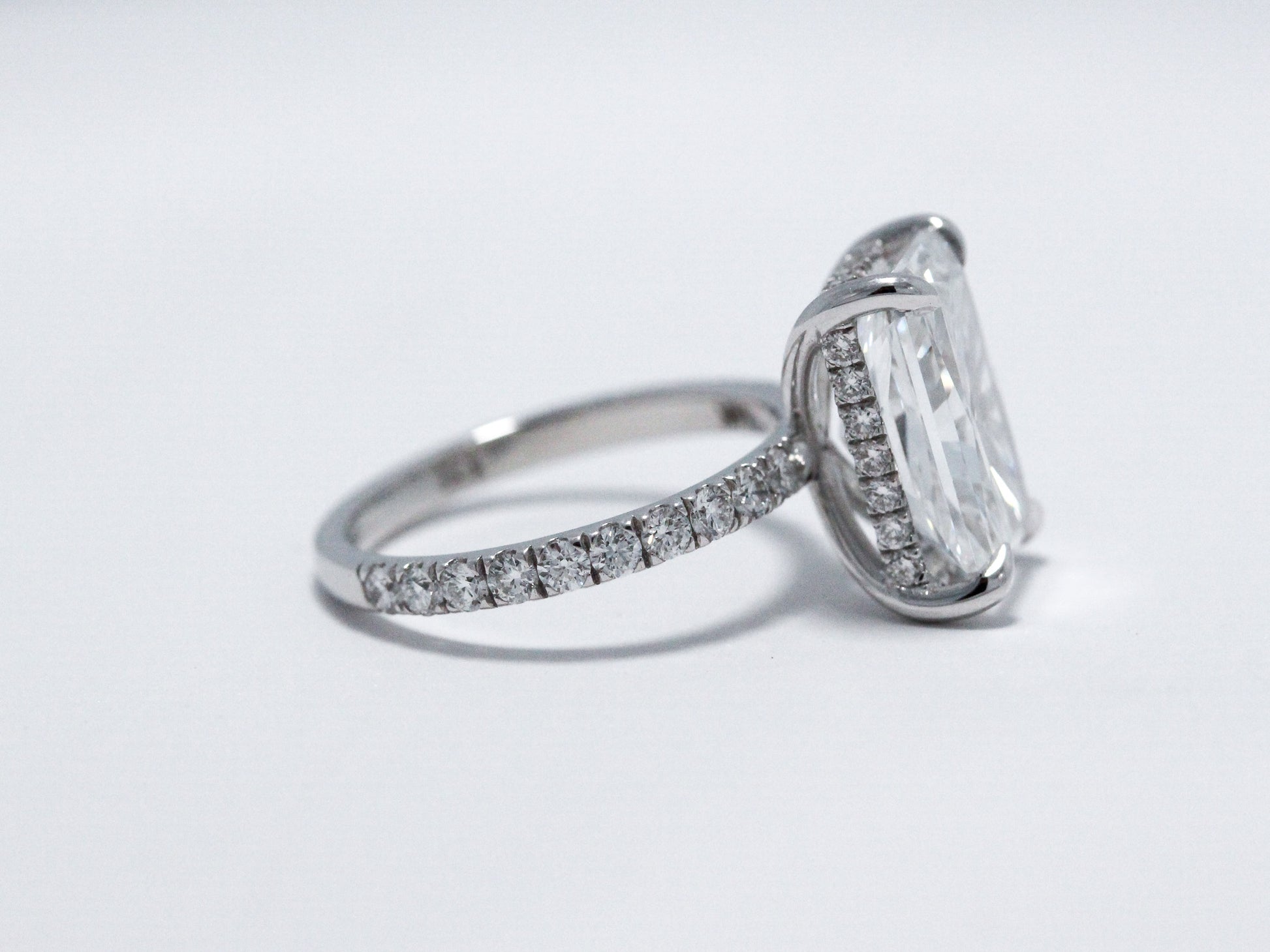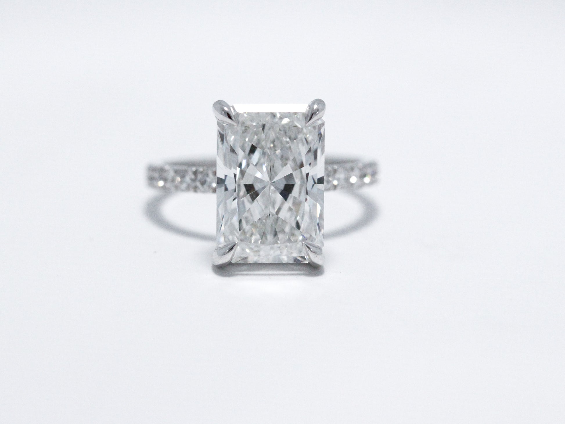 A crisp radiant-cut diamond showcased in a minimalist setting for a look that’s striking, sophisticated, and effortlessly chic.