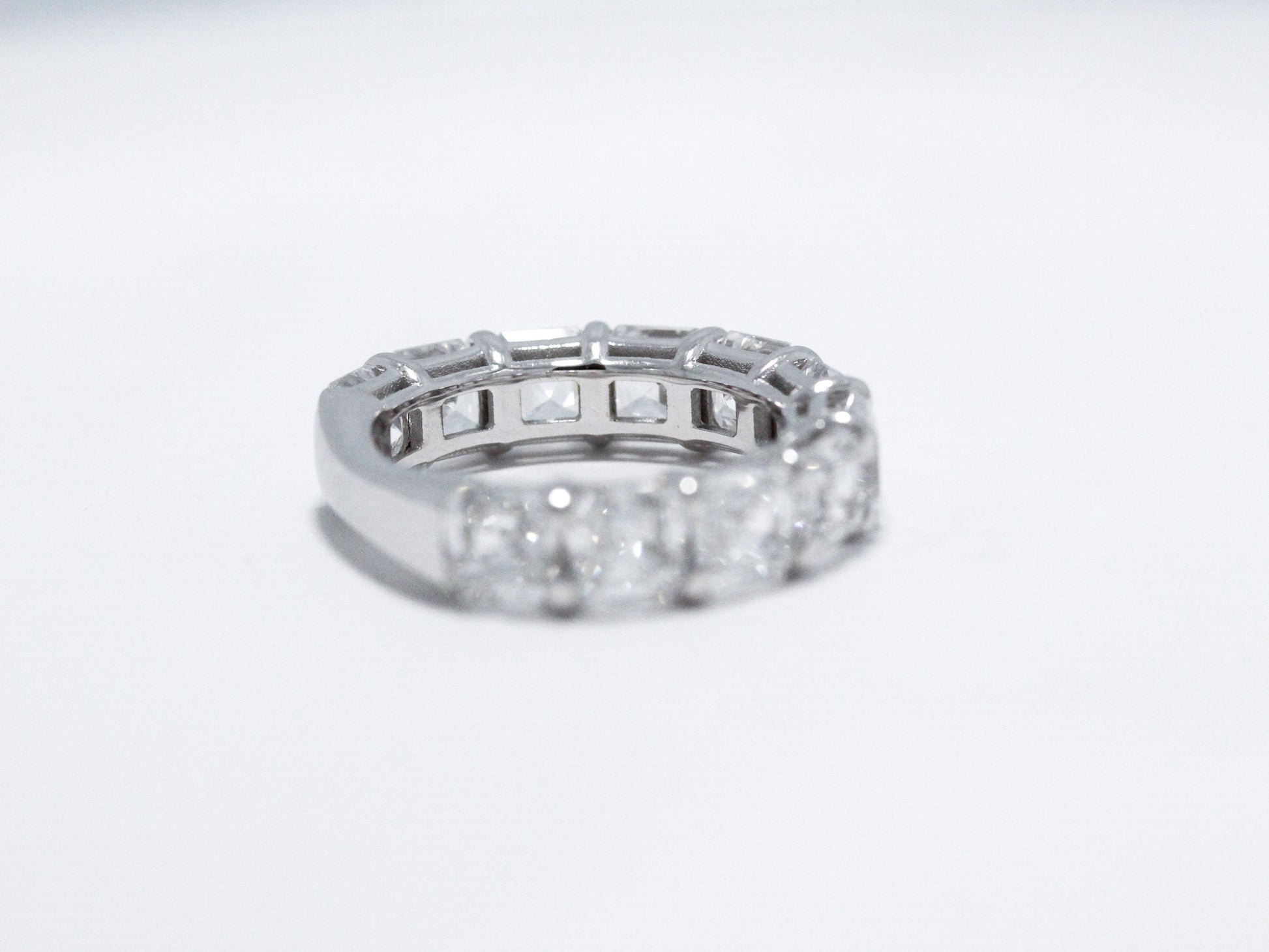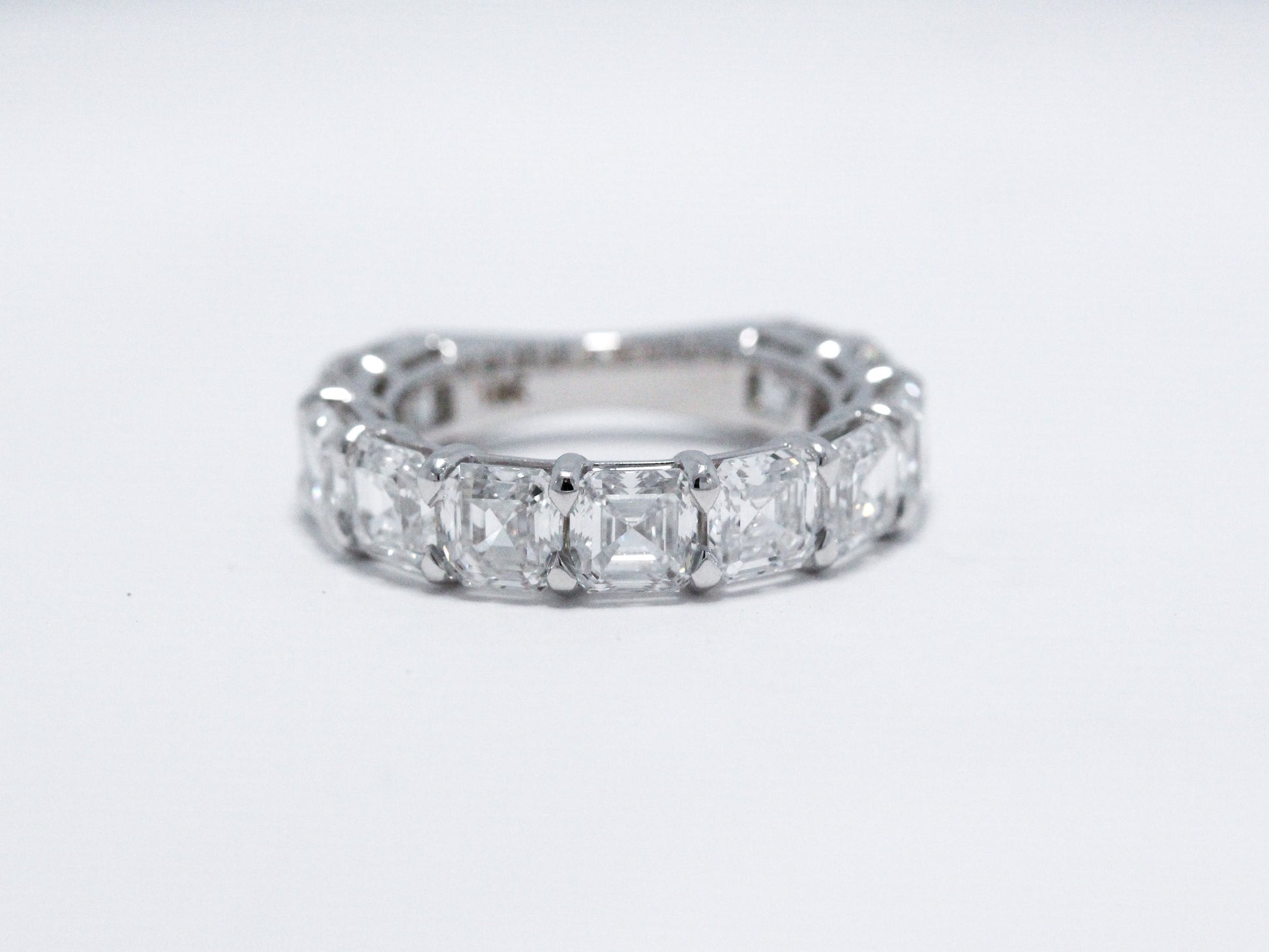This ring features 11 Asscher cut diamonds that combine for 6.60 carats total. The stones are all set into an 18 karat white gold ring.