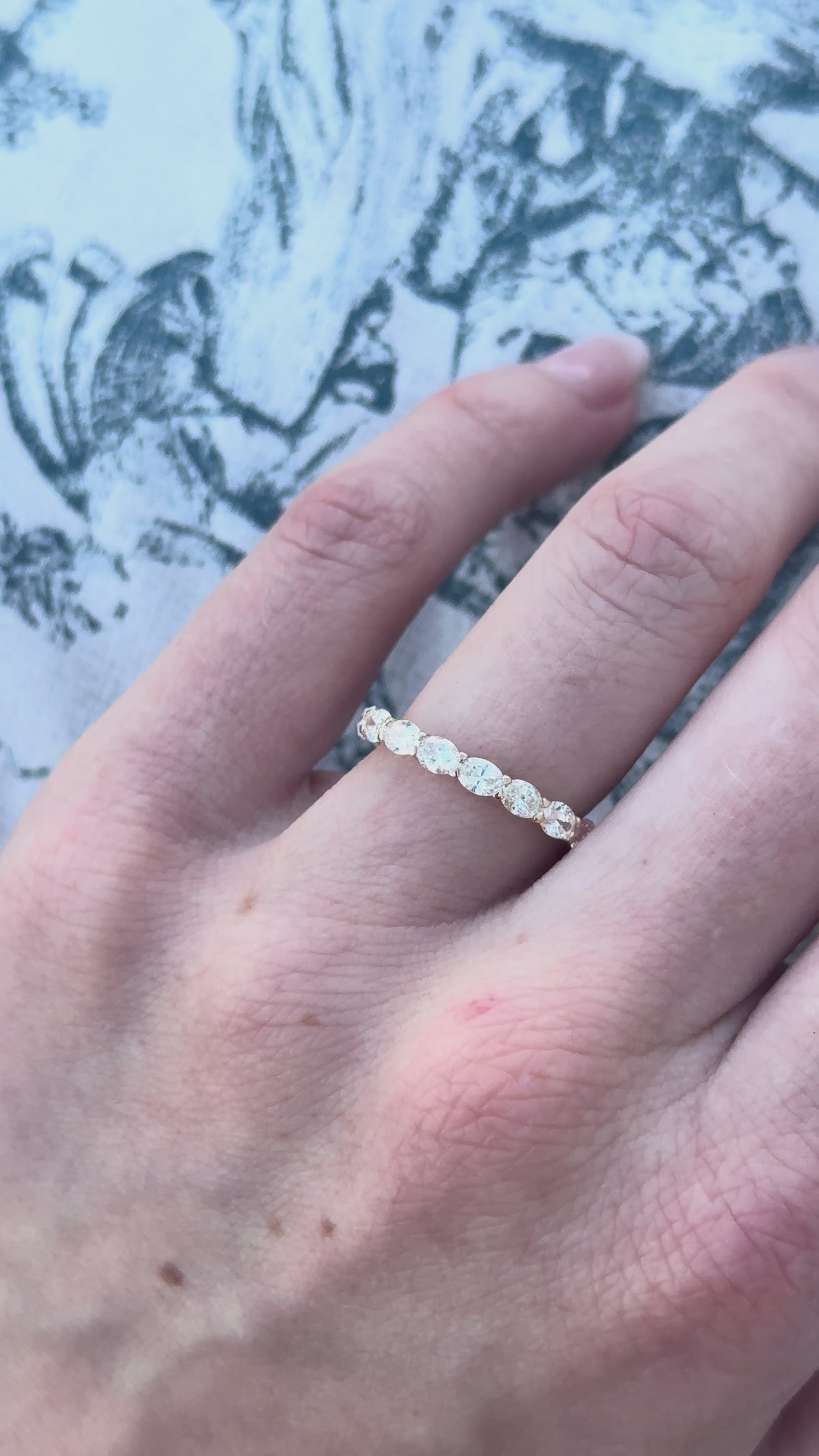 This Eternity Band features Oval-cut Natural diamonds with stones that are D-E-F color, VVS1-2 clarity. The setting of the ring is 14 karat yellow gold.