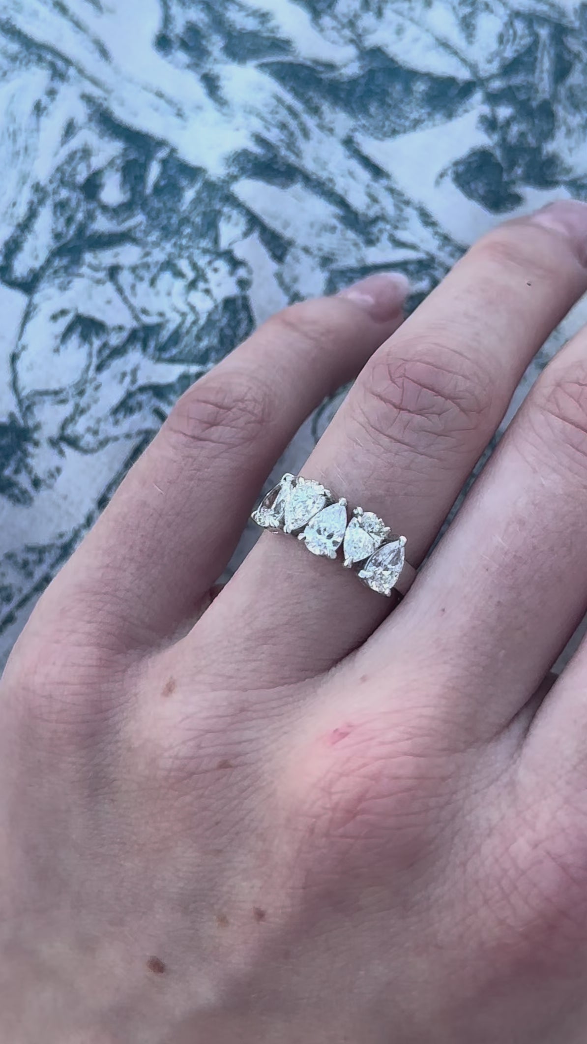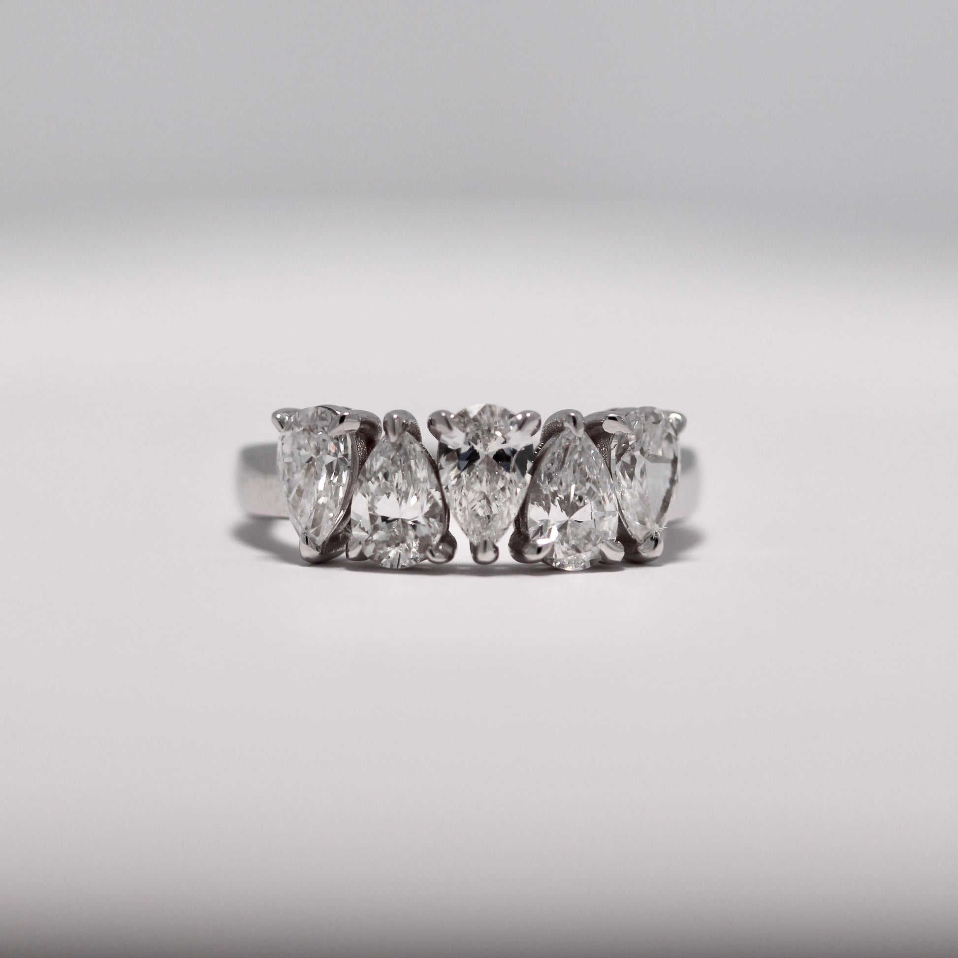 This ring features 5 pear-cut Natural Diamonds of approximately E-F color, VVS2 clarity. The stones combine for 1.79 carats total. The setting of the ring is 18 karat white gold.