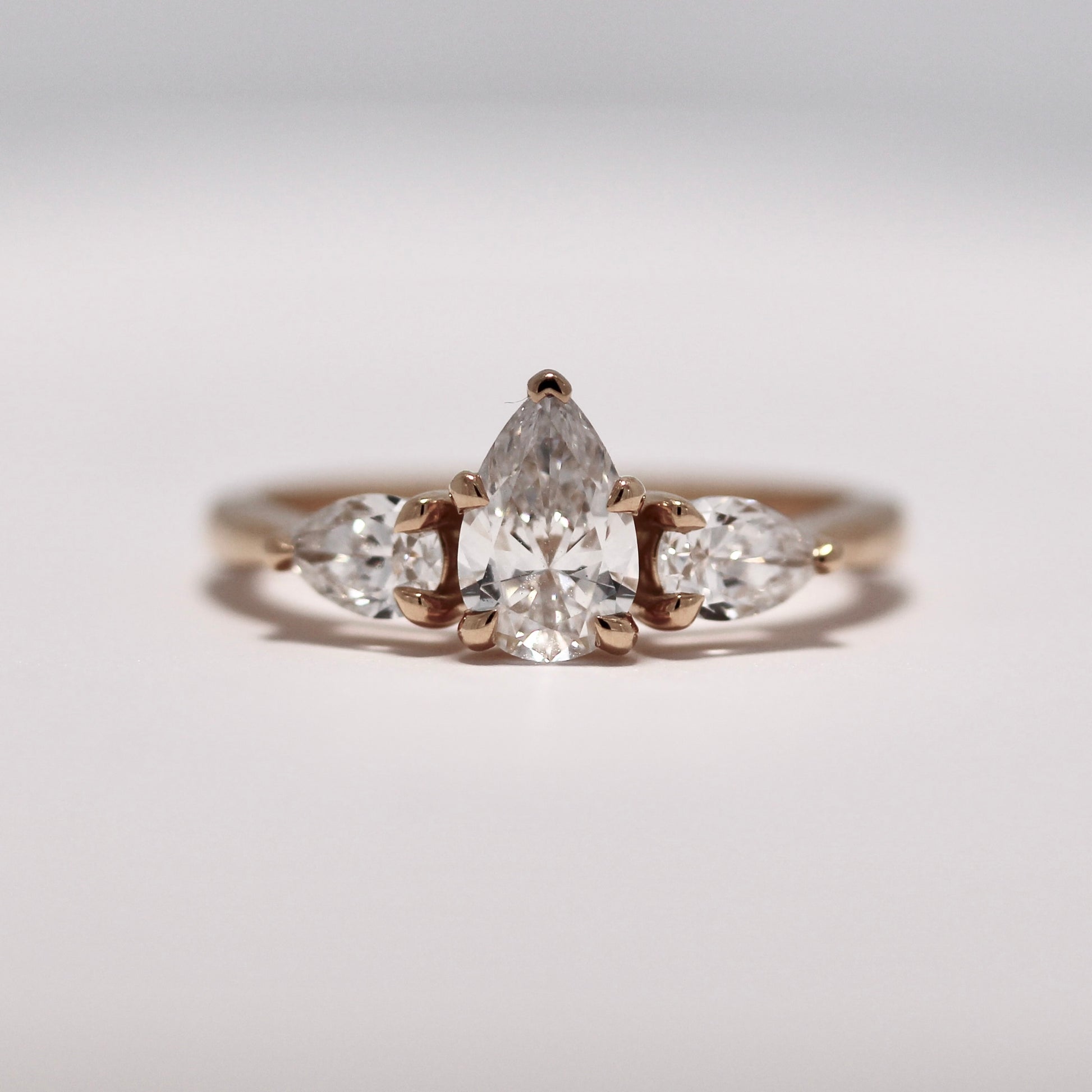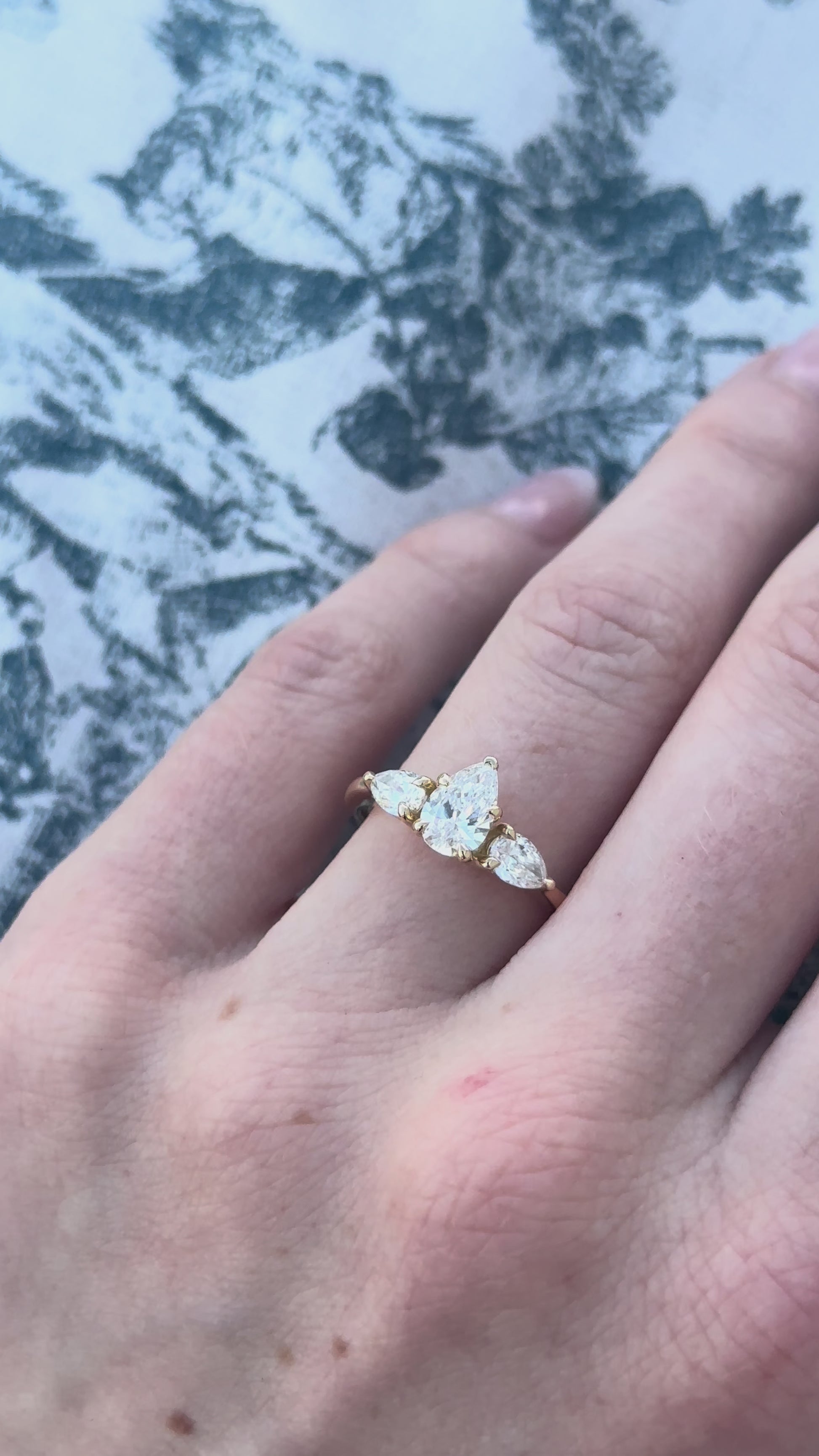 This ring centers a 1.25ct Pear cut Diamond of approximately E color, VVS1 clarity. Two additional pear cut diamonds flank the center stone. All combining for 2 carats total weight. The stones are set in 18 karat yellow gold.