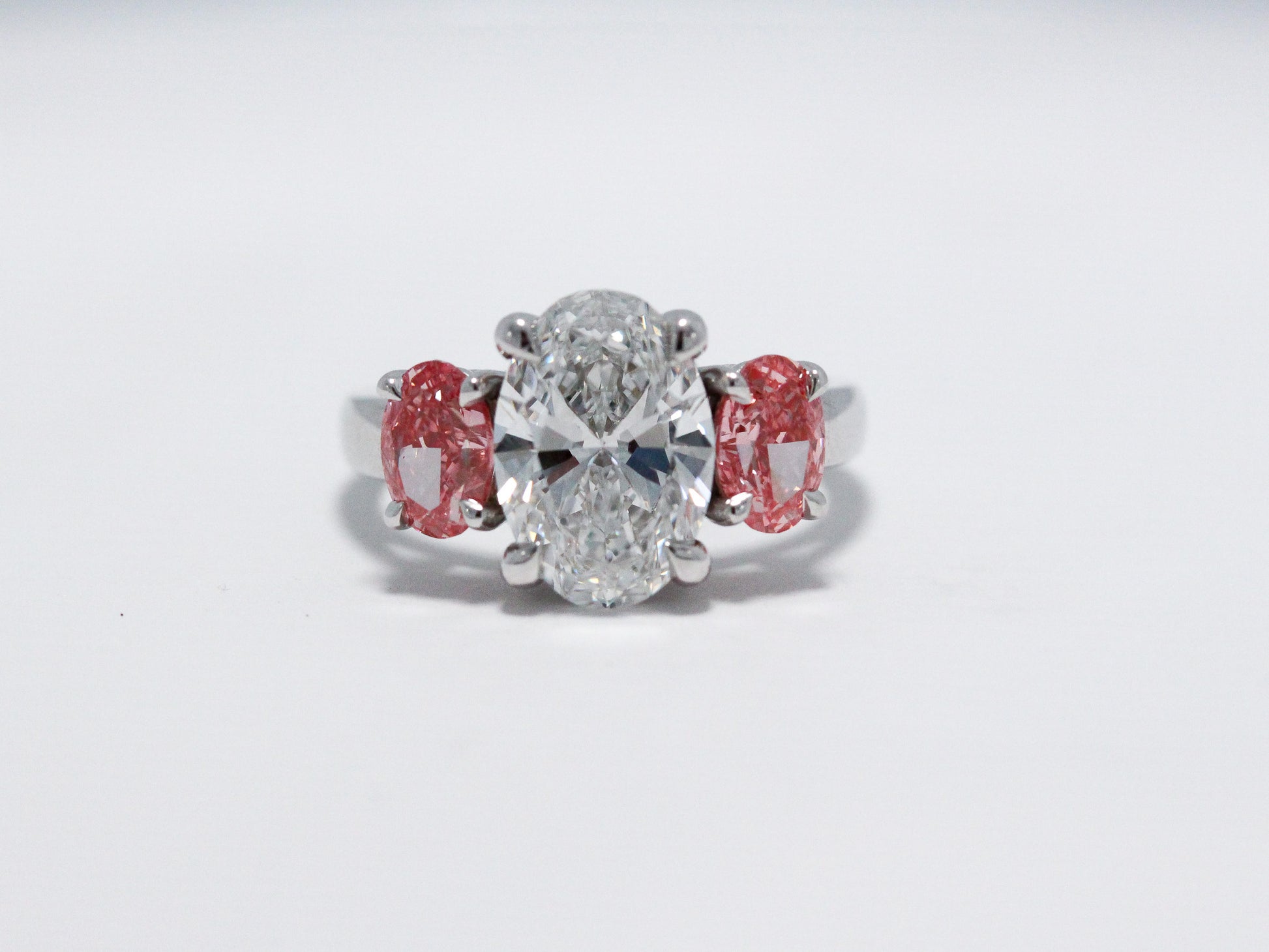 A stunning three-stone ring featuring a brilliant oval center diamond accented by two vivid pink lab-grown diamonds—crafted to bring modern romance and vibrant color to every moment.